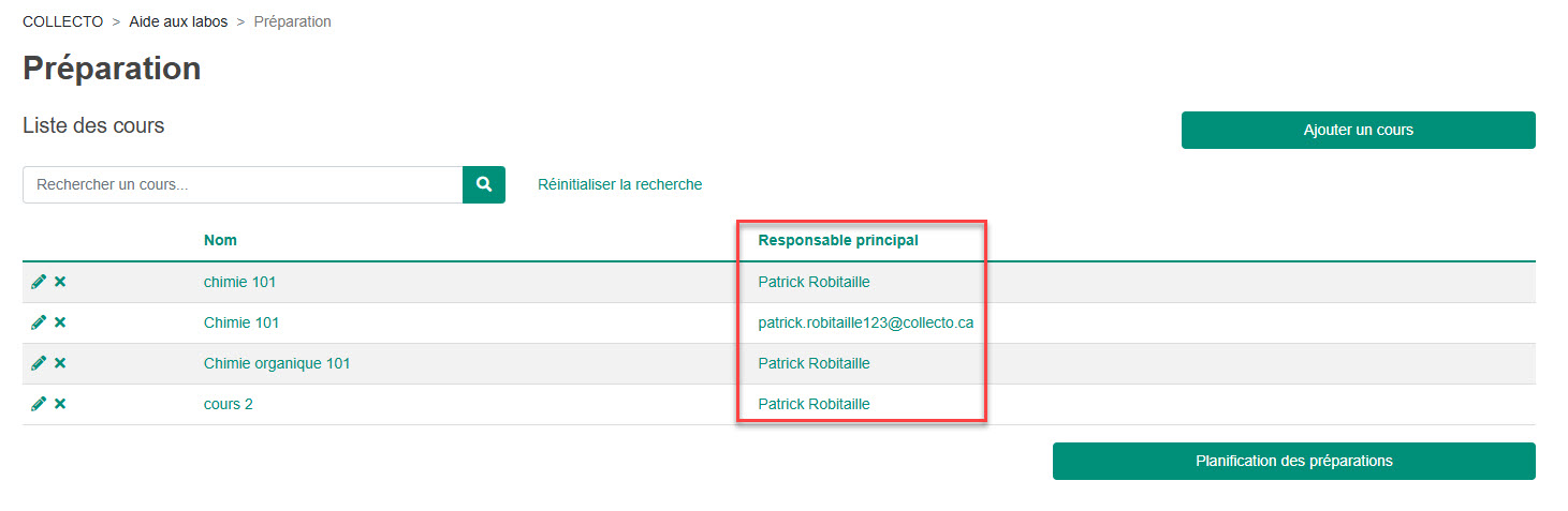 Le nom du responsable du laboratoire est inscrit sur la page des cours dans la colonne Responsable principal.