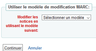 La première étape pour modifier en lot des notices est de configurer un modèle de modification dans l’outil Modèles de modification MARC.