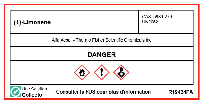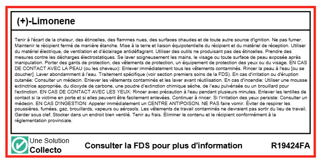 Voici une étiquette de Limonène sans les conseils de prudence: