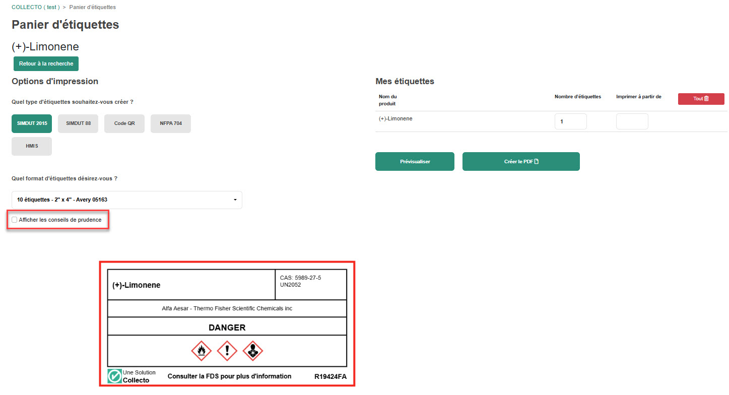 Pour ce faire, vous devez cliquer sur l'option "Afficher les conseils de prudence" dans la page de votre panier d'étiquettes.