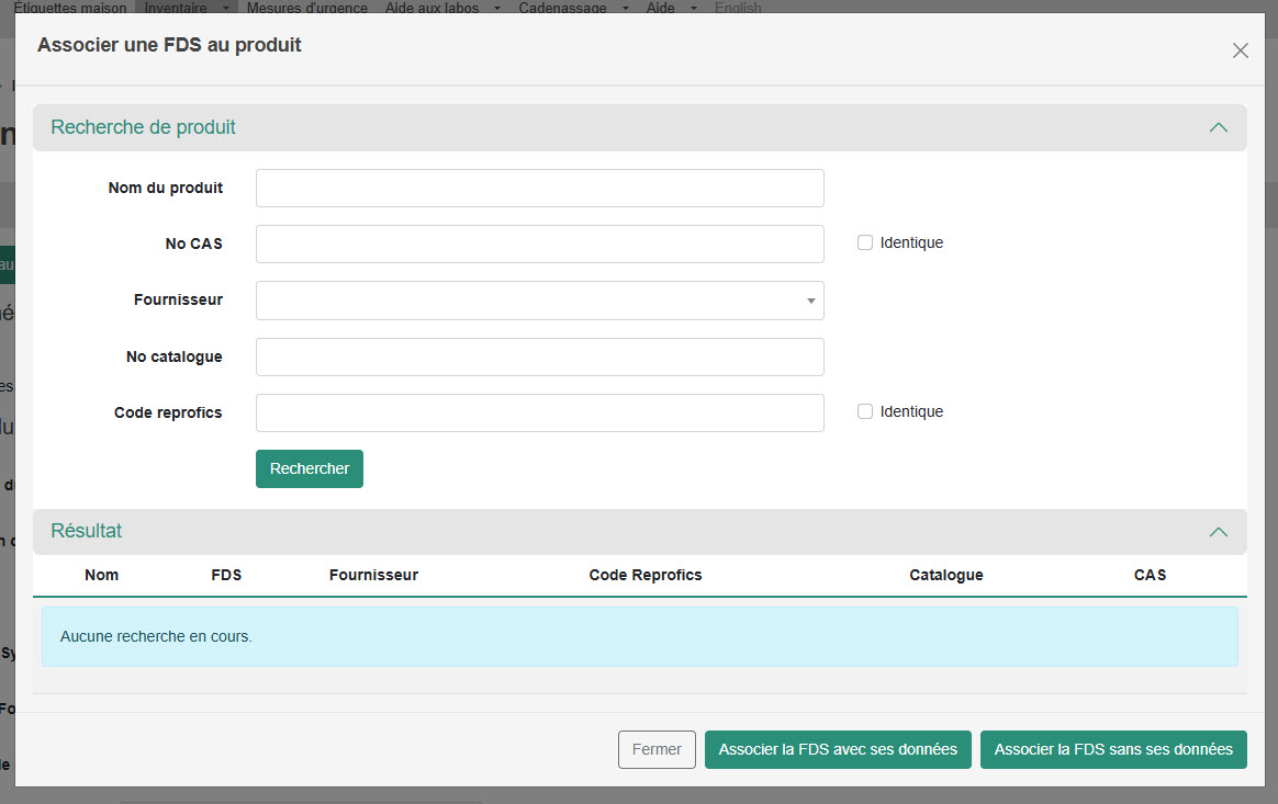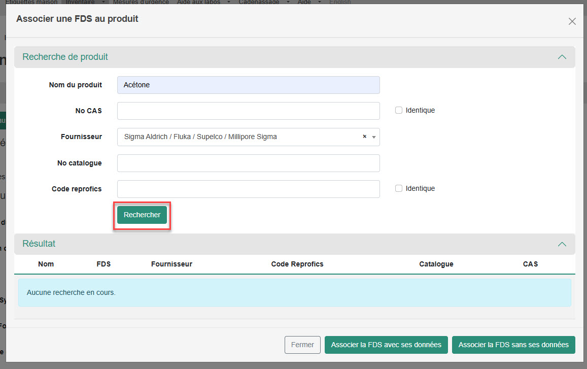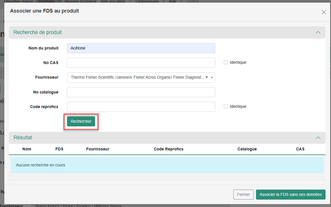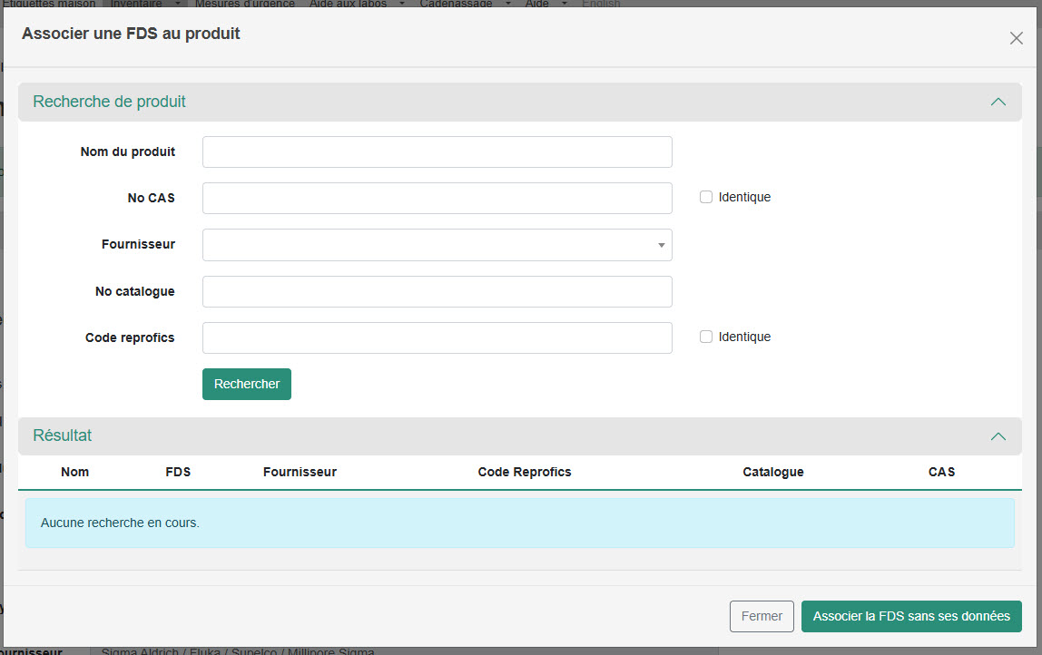 Recherche le nouveau produit avec le formulaire de recherche. Sélectionner le produit et cliquer sur le bouton "Associer la FDS sans ses données".
