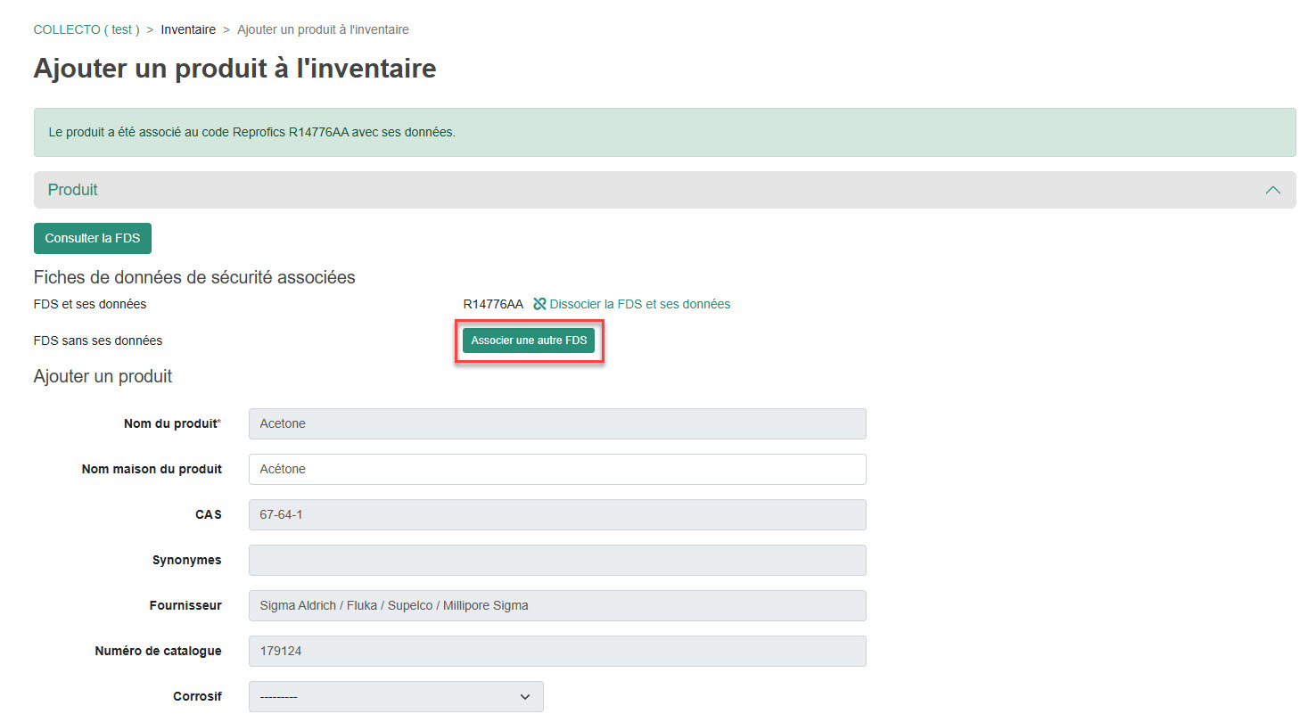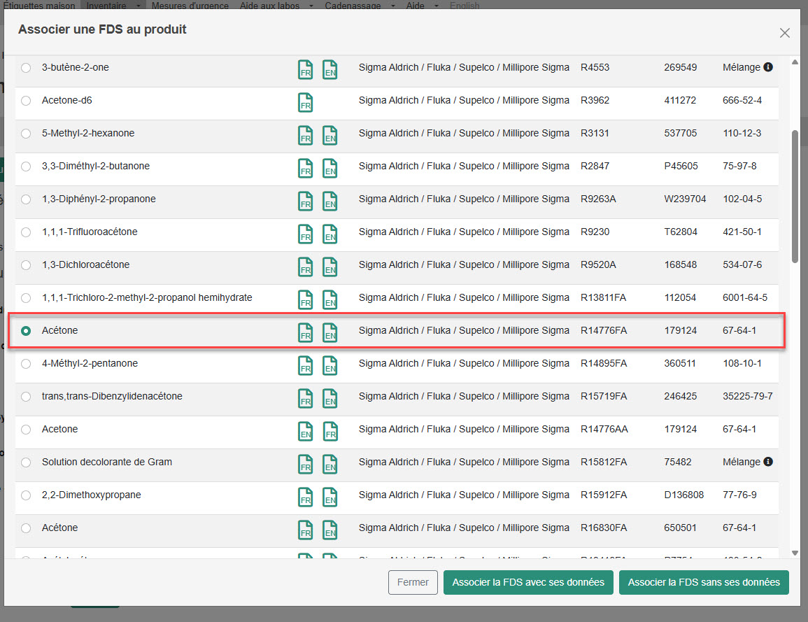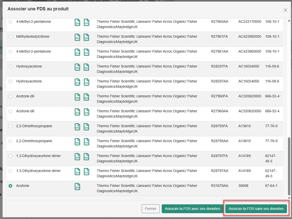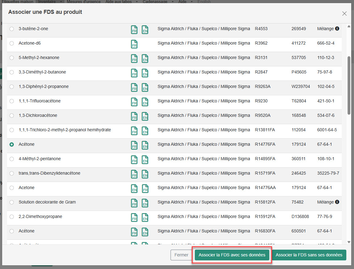 Cliquer sur le bouton " Associer la FDS avec ses données".