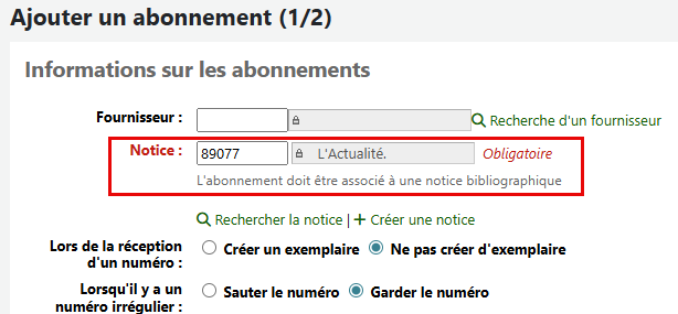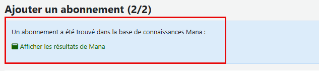 Au moment de la création de votre abonnement, Koha recherchera dans la base de connaissance de Mana pour vérifier si un abonnement existe déjà. Cette recherche se faire en fonction des éléments du titre de la notice associé à votre abonnement.