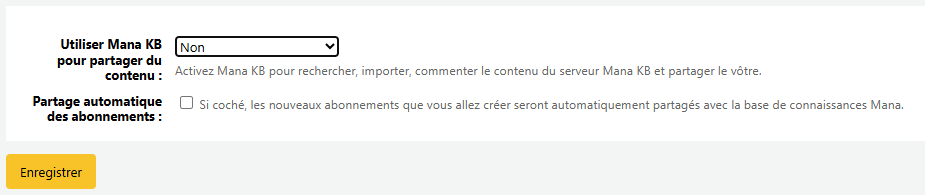 Il est aussi possible d'y accéder via le module Administration > Paramètres supplémentaires > Partager du contenu ave Mana Kb.