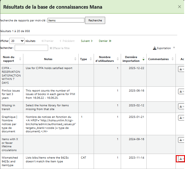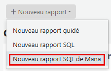 Mana vous permet d'avoir accès à une banque de rapport SQL déjà créé par d'autres utilisateurs de Koha. Dans le module Rapports, lors de la création d'un nouveau rapport SQL, vous aurez l'option Nouveau rapport SQL de Mana.