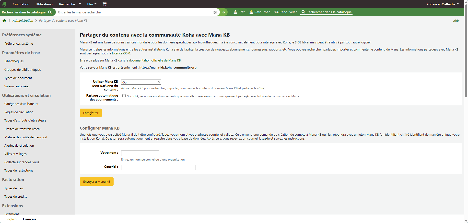 Si vous avez permis le partage de contenu, vos informations sur vos rapports et abonnements pourrons alors être transmis à la base de connaissance Mana et d'autres bibliothèques utilisant Koha pourront les consulter.