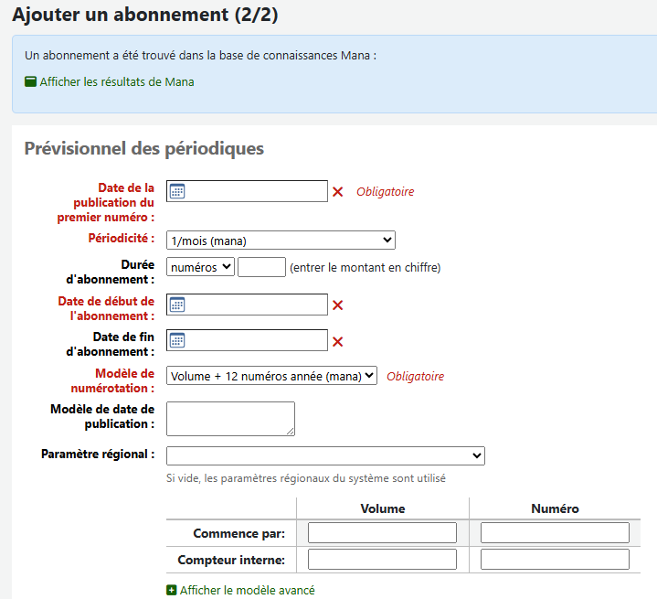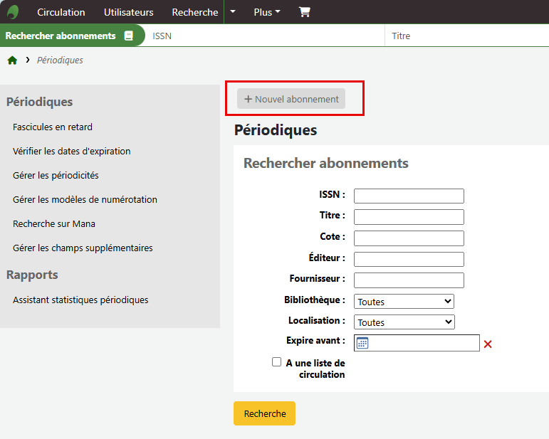 La base de connaissance Mana permet de sélectionner un modèle d'abonnement de périodique lors de la création d'un nouvel abonnement. Pour ce faire, vous devez vous rendre dans le module des périodiques et créer un nouvel abonnement.
