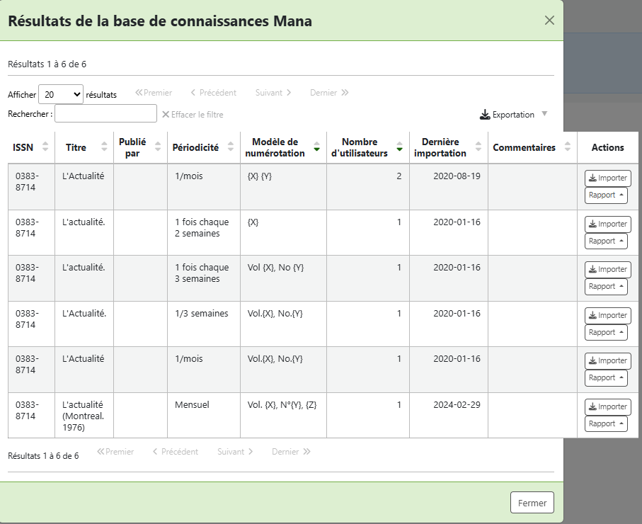 Choisir celui qui vous convient en cliquant sur le bouton [Importer] situé dans la colonne des Actions. Les