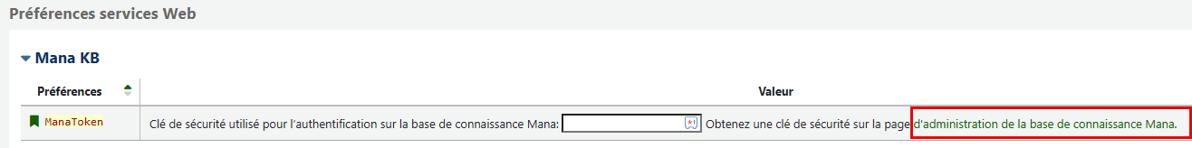 Si vous le souhaitez, il est possible d'obtenir une clé de sécurité pour authentifier votre site Koha avec le Mana KB. Pour créer le compte, cliquer sur le lien inscrit dans la préférence système Manatoken.