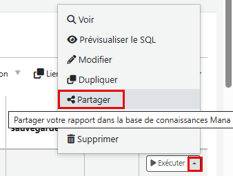 rapports lorsque Mana est activé sur votre instance, il est aussi possible de choisir les rapports que vous désirez partager. Pour ce faire, cliquer sur la flèche dans la colonne des actions et sélectionner Partager.