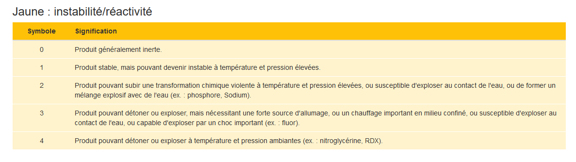 Chaque tableau du guide concerne une section colorée du losange formant le pictogramme de la classification NFPA 704.