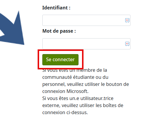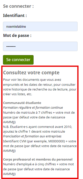 Si des instructions de connexion se trouvent sous les boîtes de connexion, ces instructions sont habituellement placées dans la section OPACLoginInstructions, dans les personnalisations HTML. Cette section apparait sous la boîte de connexion manuelle :