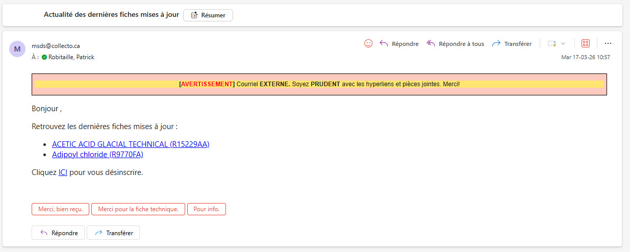 Ce courriel envoyé une fois par mois listera l'ensemble des fiches d données de sécurité mise à jour dont vous avez une association forte avec un des produits de votre inventaire.