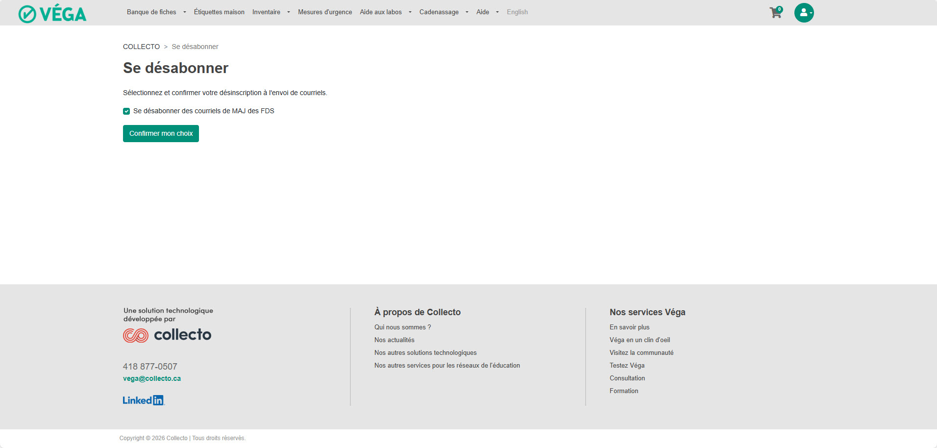 Une fois par mois, un courriel sera envoyé aux usagers et listera les Fiches de données de sécurité disponible dans la banque de Véga pour lesquels une mise à jour de la fiche a été effectuée par l'équipe de Collecto.