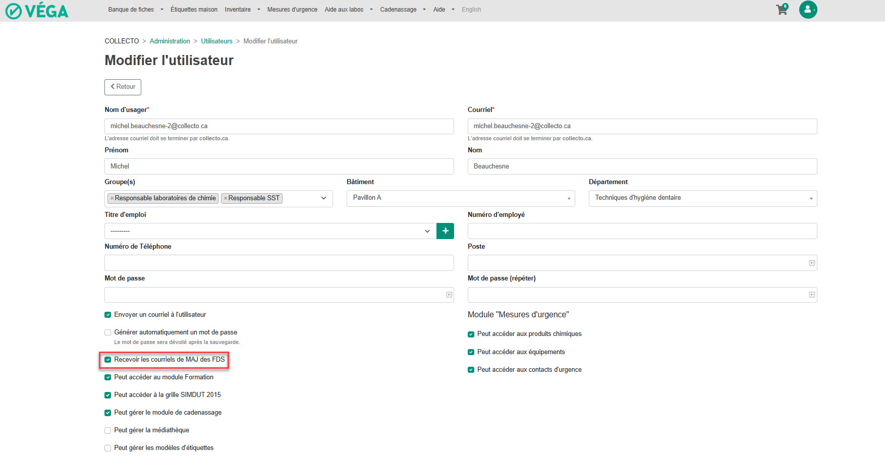 Il est possible dans Véga de s'abonner à l'envoi d'un courriel automatisé pour les mises à jour de fiches de données de sécurité.