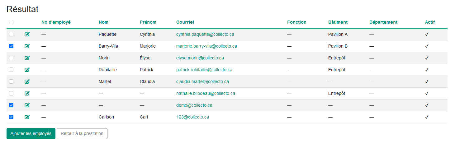 Pour ajouter des employés, vous devez cocher la case située à droite du tableau des résultats.