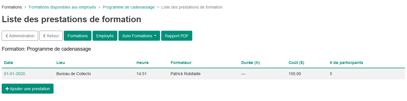 Une prestation est en fait une séance de formation suivie ou qui sera suivie par vos utilisateurs. Pour créer une prestation, vous devez vous diriger vers la section des formations.