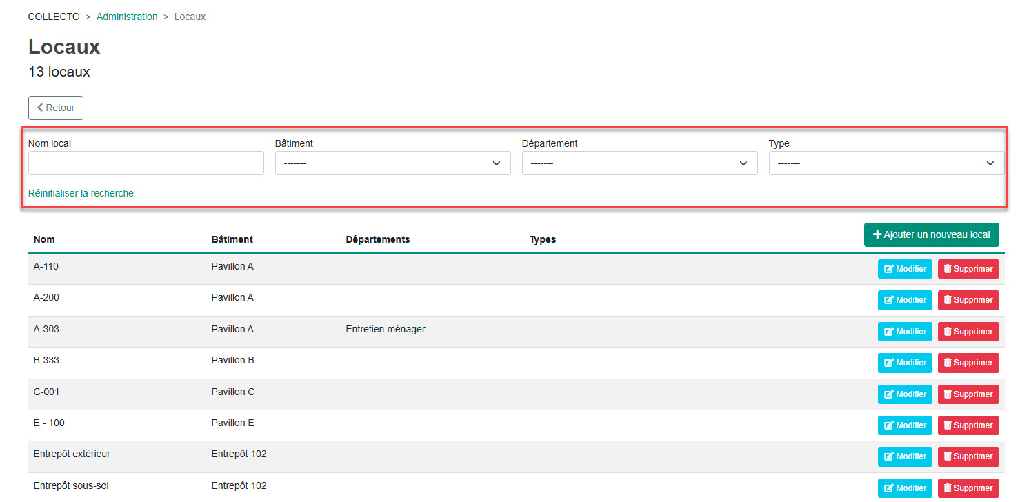 Plusieurs filtres sont disponibles sur la page de tous les locaux de votre organisation pour vous aider à filtrer la liste.