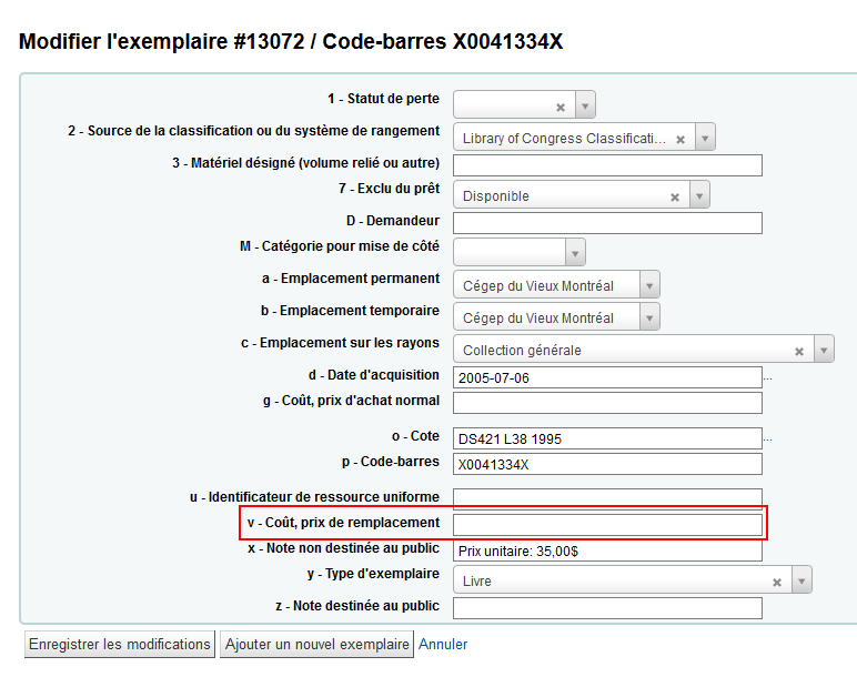 Voici comme exemple un exemplaire d’un document ou le champ pour le pris de remplacement est vide qui est en prêté à un usager.