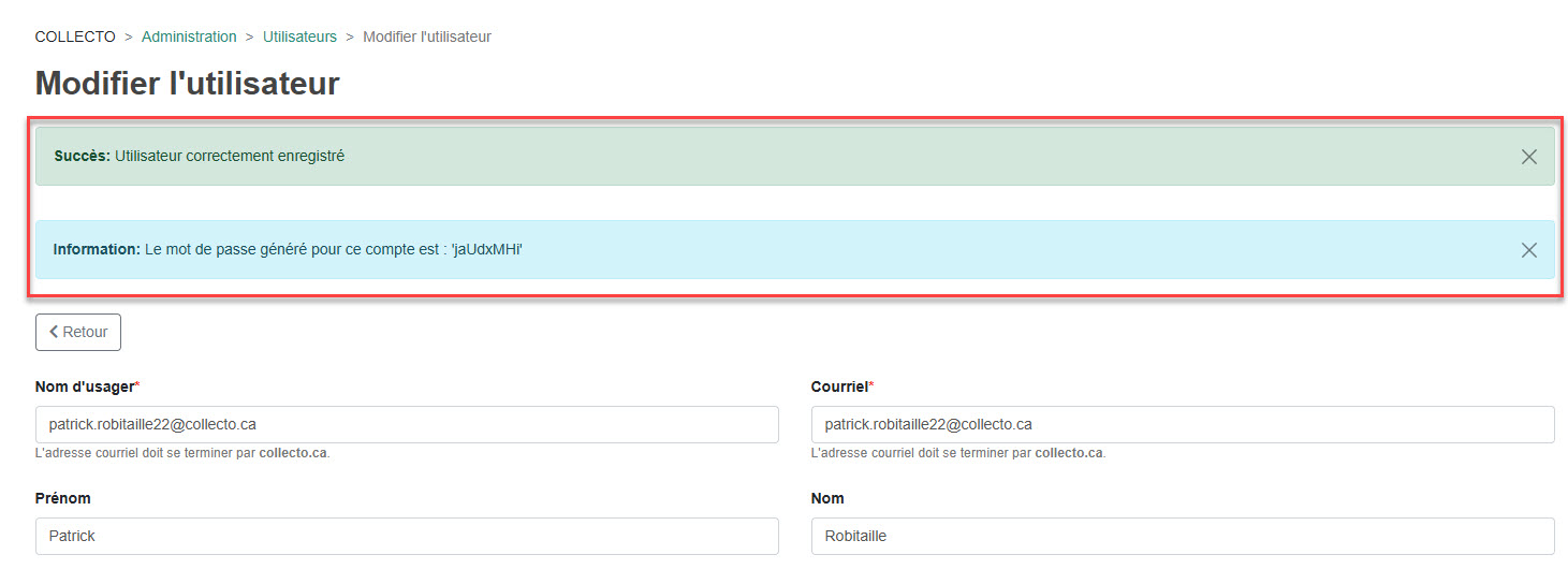 Prendre en note le mot de passe généré (ou celui que vous aurez vous même choisi) afin de la partager au nouvel utilisateur.