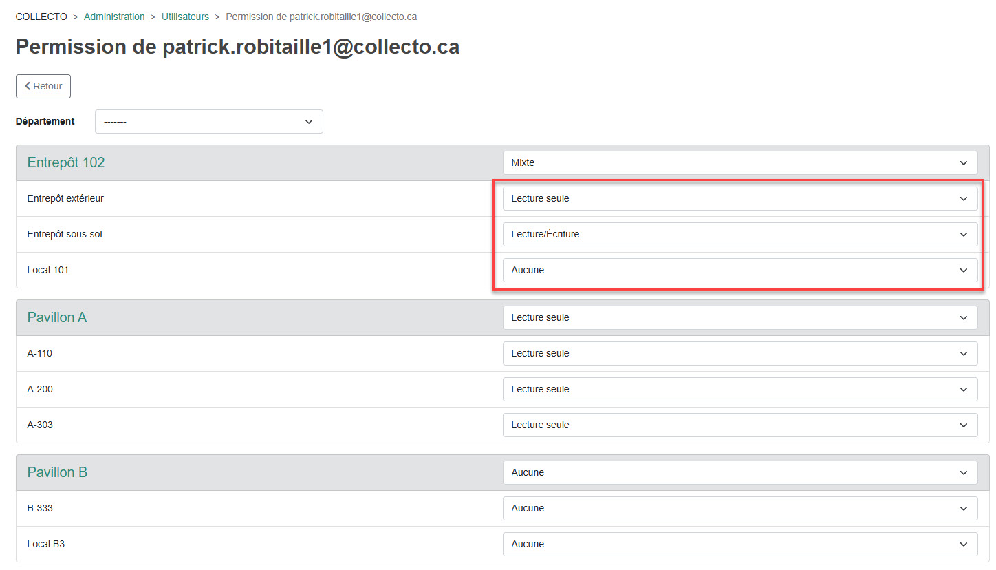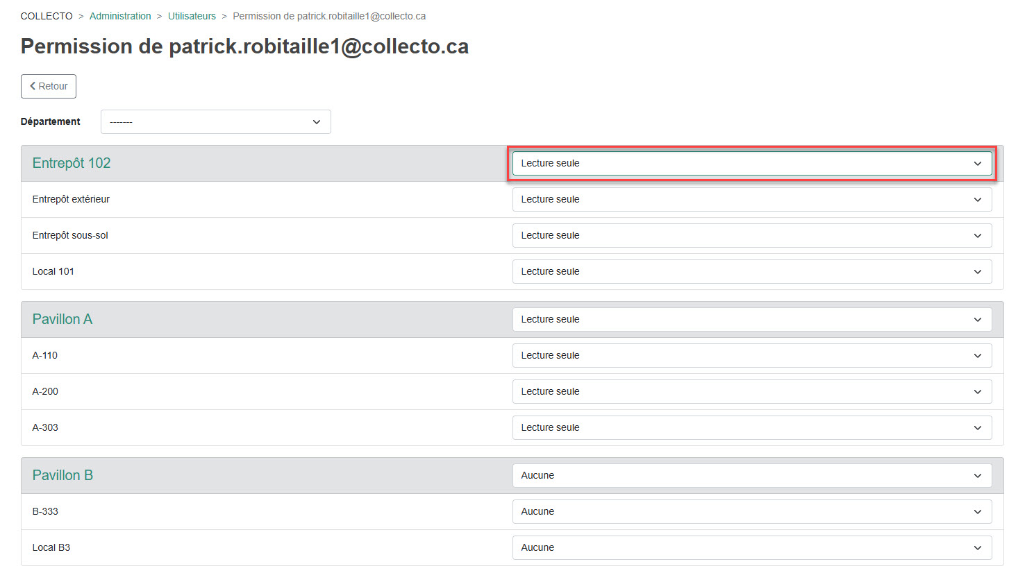 Ouvrir la bande déroulante à côté de chacun des bâtiments de votre organisation et sélectionner le type de permission souhaitée.