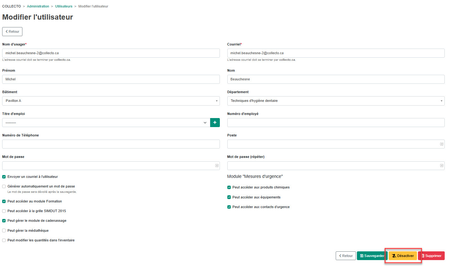 Pour désactiver un compte, cliquer sur l'option "Désactiver".
