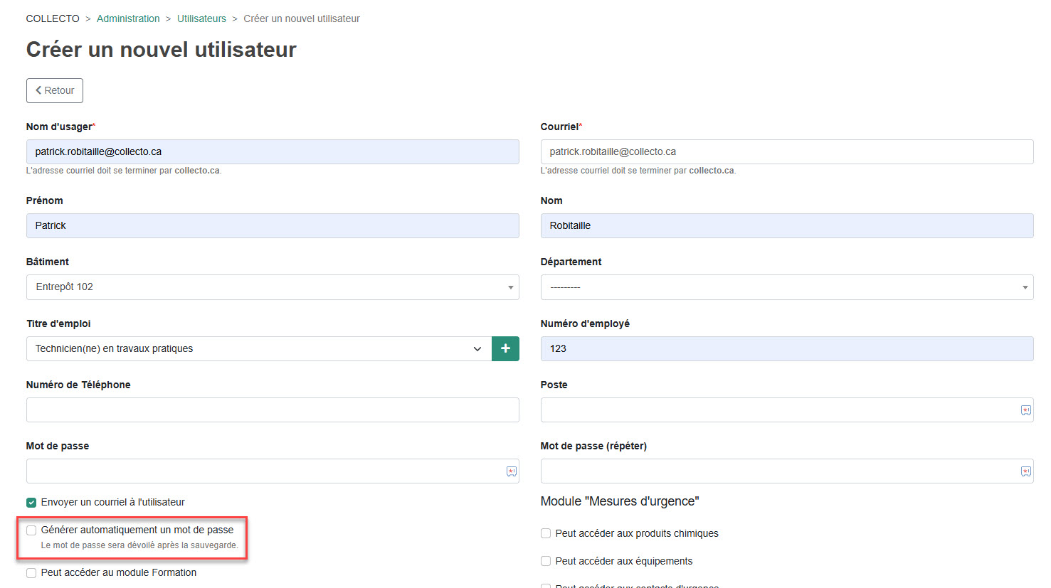 Idéalement pour créer un mot de passe sécuritaire, cocher l'option « Générer automatiquement un mot de passe », celui-ci sera dévoilé auprès la sauvegarde.
