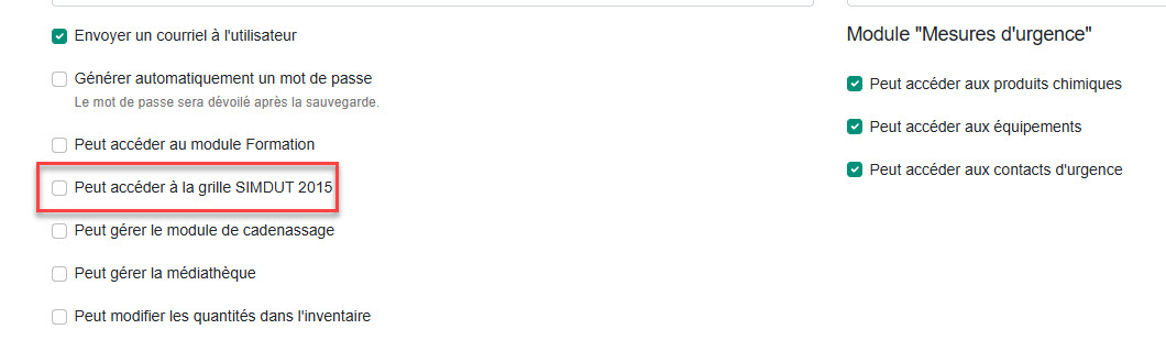 Cette permission donne accès à la gestion des rapports de conformité du SIMDUT 20215 grâce à la grille de conformité de Véga.