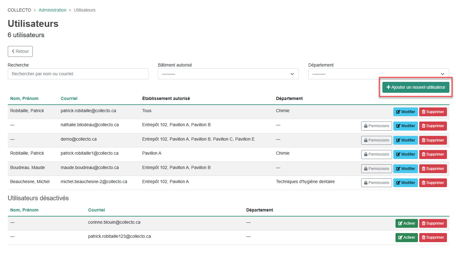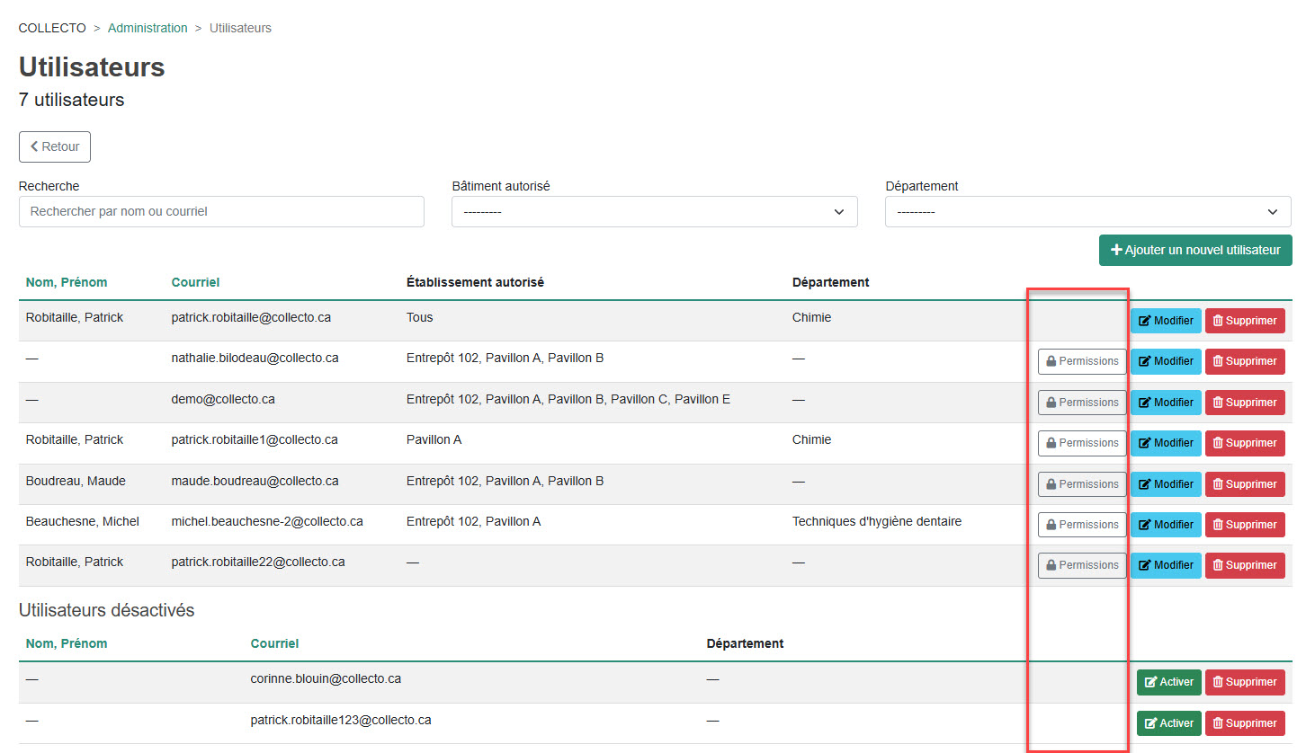 Attention! Actuellement, il est possible pour vous d'ajouter des usagers qui possèdent un nom de domaine autorisé. Si vous désirez ajouter un ou des usagers avec un autre nom de domaine (fin de l'adresse courriel), il faut en faire la demande à notre équipe.Cliquer sur le bouton Permissions du nouvel utilisateur.
