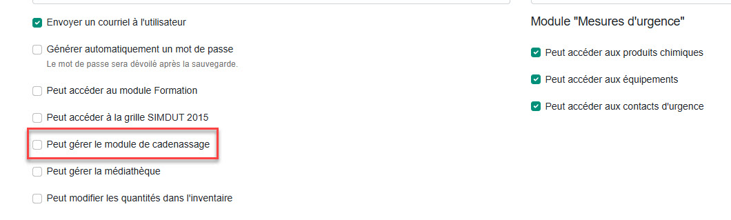 Cette permission donne accès en mode édition au module de Cadenassage. Ce qui signifie que l'utilisateur avec cette permission peut ajouter/modifier et supprimer les données inscrites dans ce module.