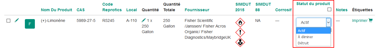 Il est possible de distinguer les produits en trois statuts (les produits actifs, les produits à éliminer et les produits détruits) lors de l'ajout et/ou modification d'un produit dans votre inventaire.