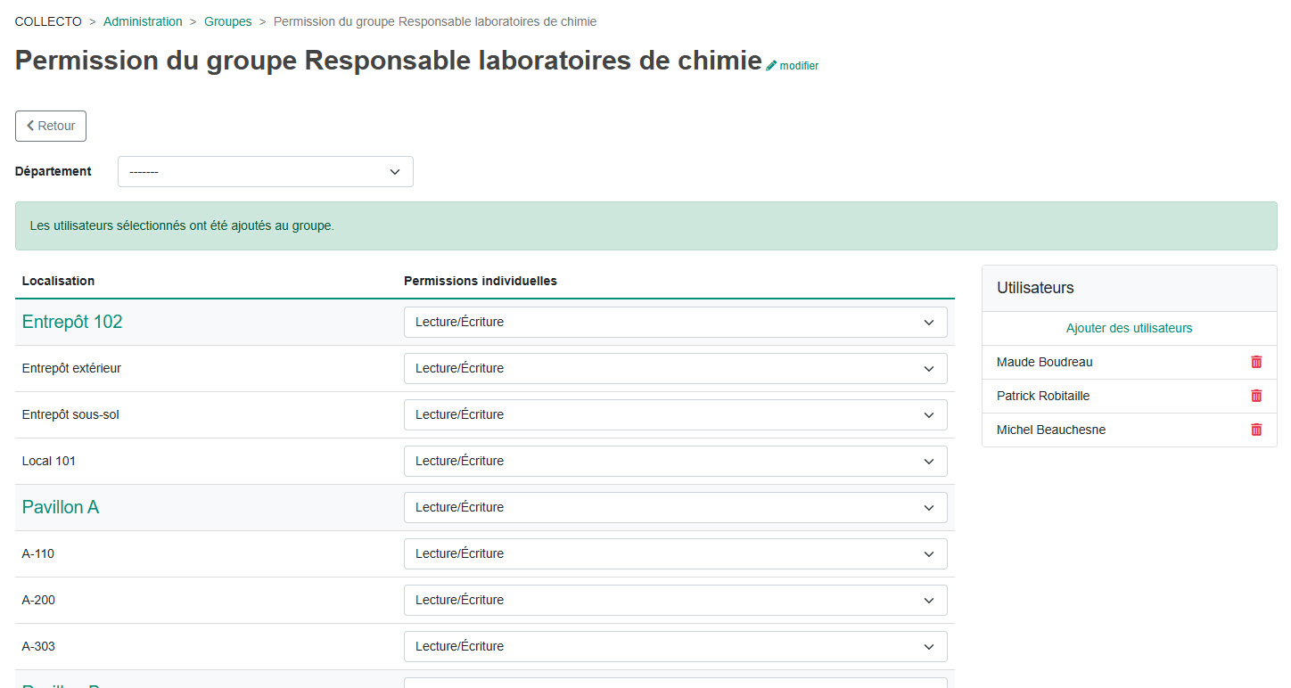 Les usagers seront ajoutés au groupe et auront les permissions assignées dans le compte. Les usagers apparaîtront dans le tableau de droite de la liste d’utilisateurs de ce groupe.