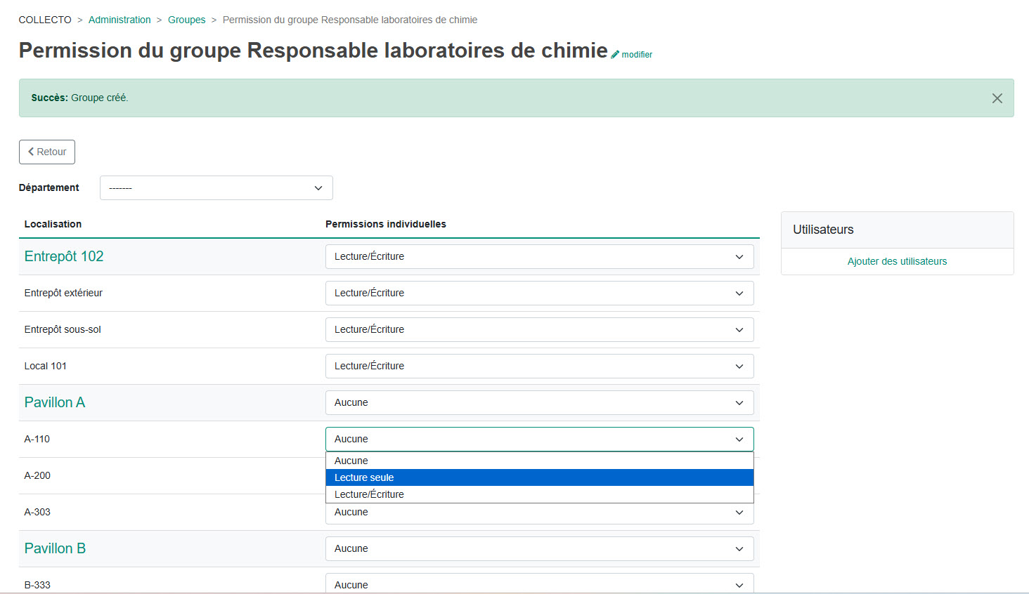 La prochaine étape est d'indiquer les permissions de ce groupe pour le type d'accès à l'inventaire des bâtiments et locaux.