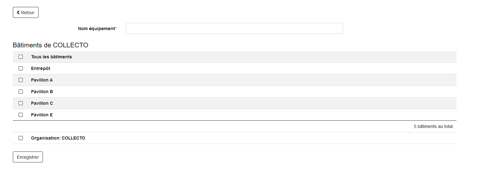 vous devez laisser les champs bâtiment et local vides et choisir le type "Équipements". Vous aurez ainsi accès au nouvel équipement au niveau de vore organisation.