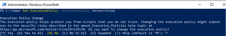 4. Tout d’abord, lancez la commande : Set-ExecutionPolicy -ExecutionPolicy Unrestricted puis acceptez le changement.
