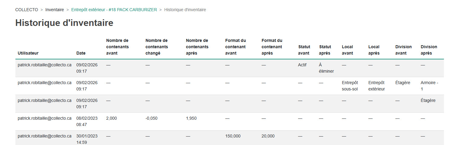 Une fois un produit inscrit dans votre inventaire, il est possible de suivre les modifications ultérieures effectuées par les utilisateurs.