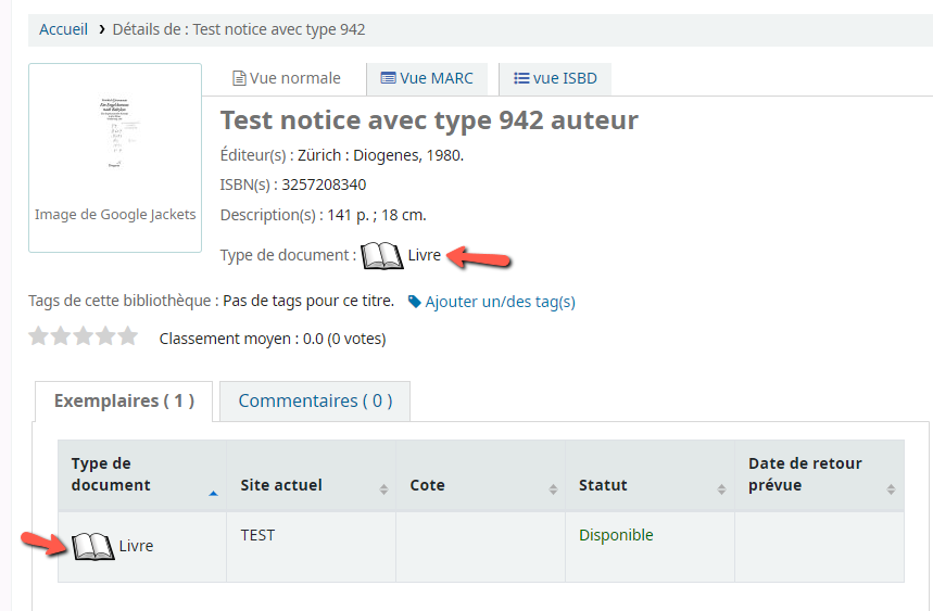 Si la zone 942$c contient un type de document différent du type de document dans l'exemplaire, les deux icones apparaitront dans la vue normale de la notice.