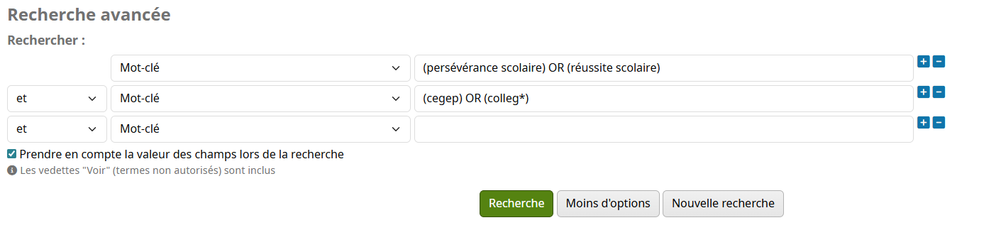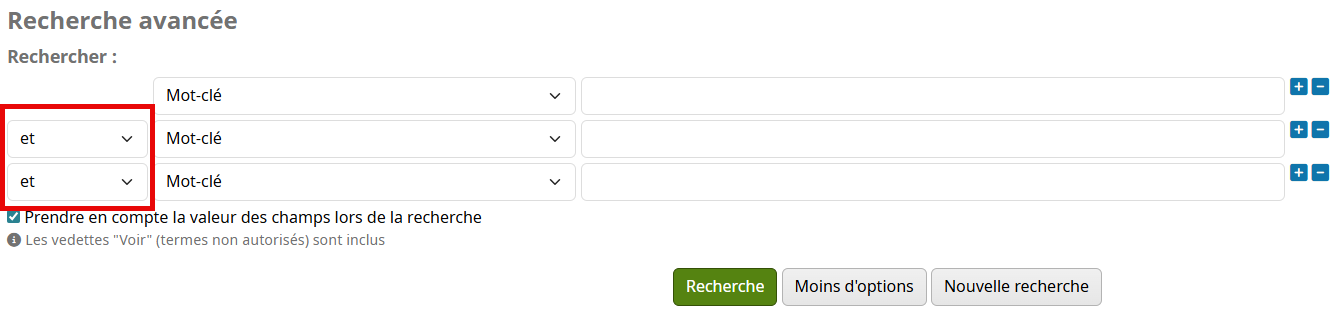 Il n'est pas conseillé d'utiliser différents opérateurs booléens simultanément dans les options de la recherche avancée. Il est préférable de construire une équation de recherche dans les boîtes de recherche en utilisant les parenthèses.