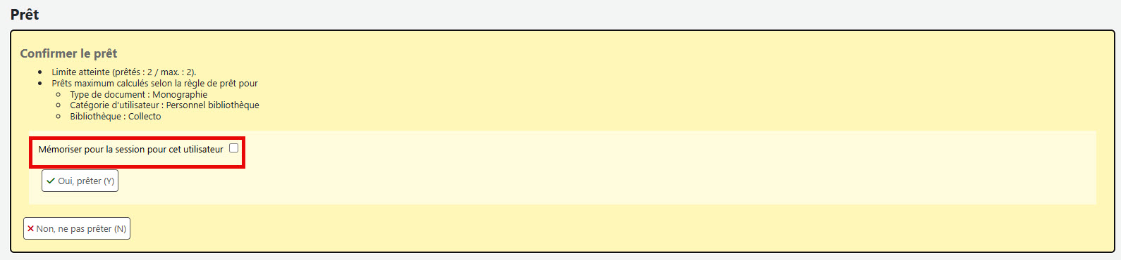 - Ce correctif modifie la fonctionnalité « CheckPrevCheckout » des préférences système afin qu'elle vérifie également les emprunts actuels des usagers et affiche le message de confirmation « L'usager a emprunté ce titre :… ». Les bibliothécaires doivent désormais confirmer si l'ouvrage sera prêté à l'usager. https://bugs.koha-community.org/bugzilla3/show_bug.cgi?id=38356
