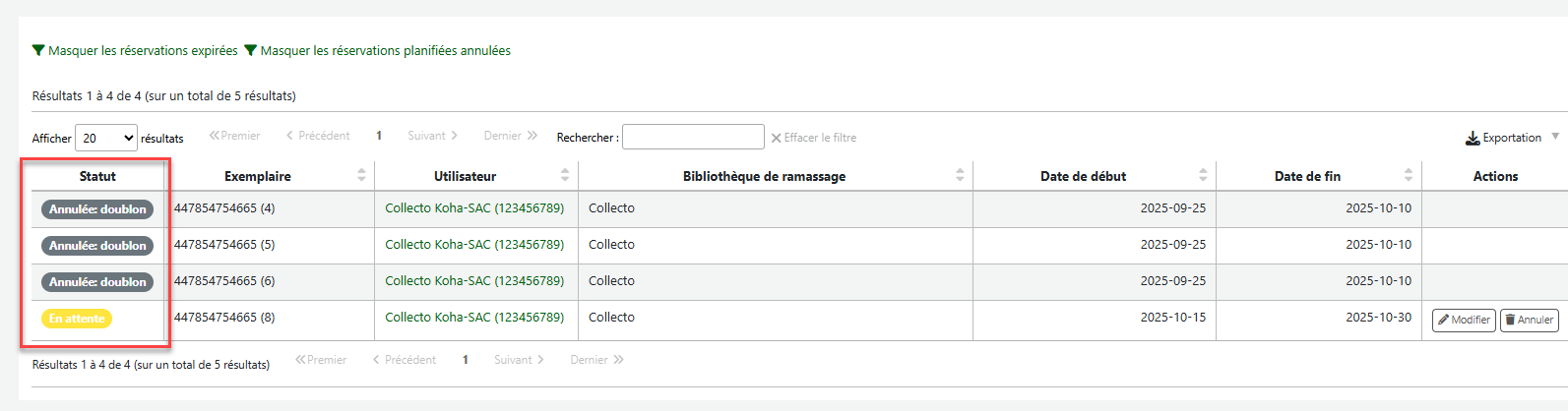 - Ajout d'une colonne de statut au tableau des réservations pour suivre l'état d'une réservation, notamment les statuts « nouvelle », « annulée » et « terminée ». https://bugs.koha-community.org/bugzilla3/show_bug.cgi?id=37601