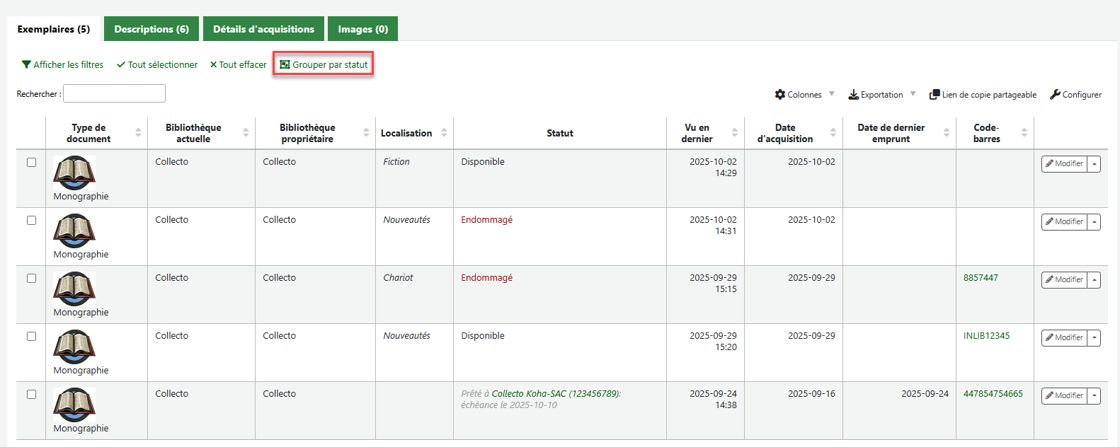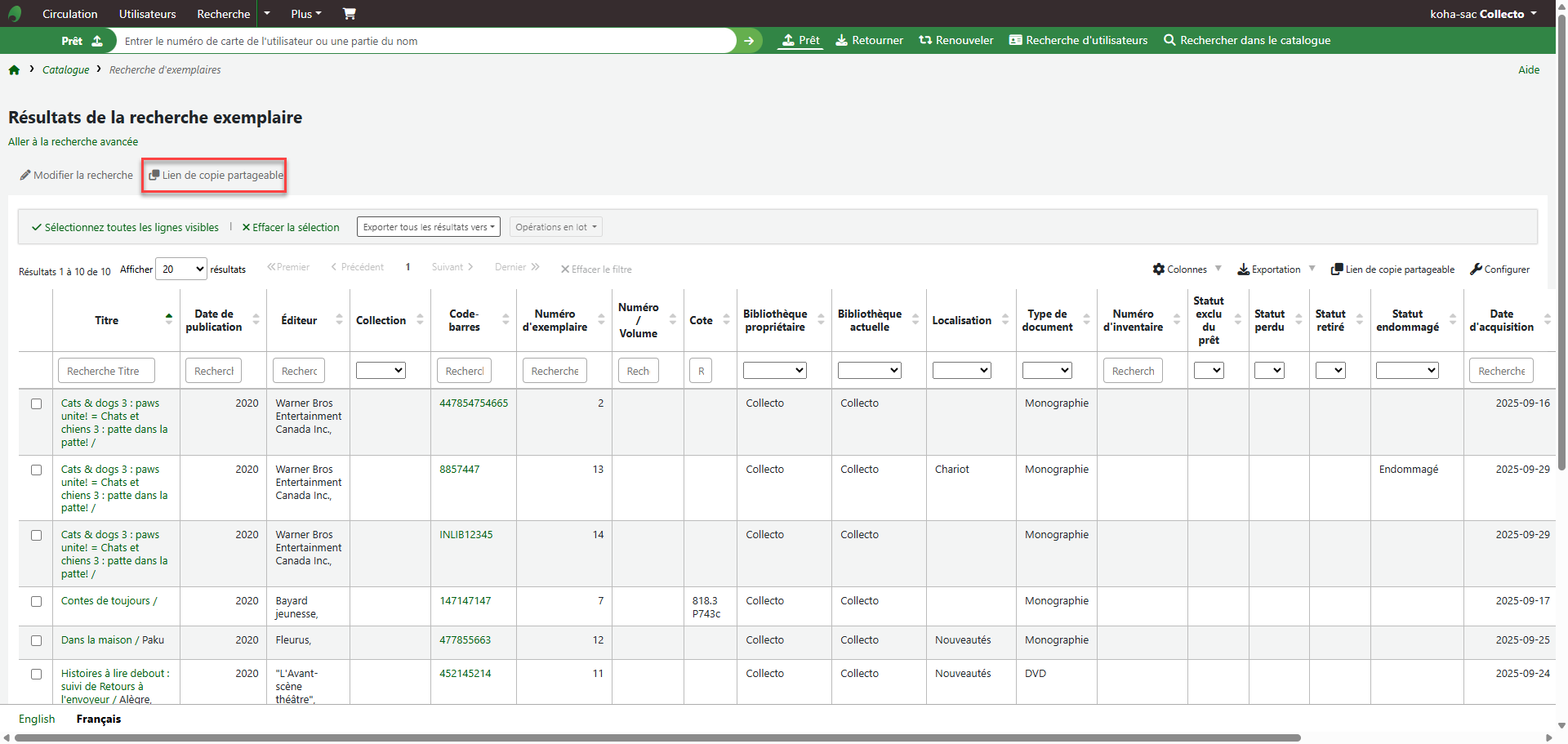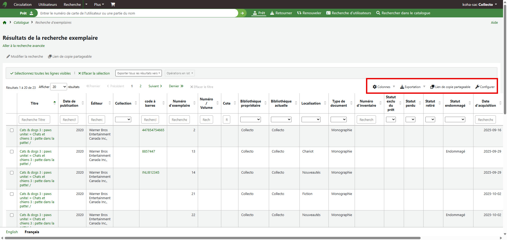 - Le tableau des résultats de recherche d'exemplaires est désormais configurable via les paramètres du tableau.(Demande de la comm.) https://bugs.koha-community.org/bugzilla3/show_bug.cgi?id=37238