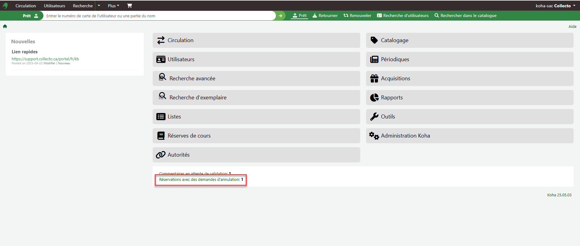 - Ajout d'un lien sur la page d'accueil pour les réservations en attente avec demande d'annulation. Nouvel onglet dans les réservations pour celle en attente d'annulation.https://bugs.koha-community.org/bugzilla3/show_bug.cgi?id=36064