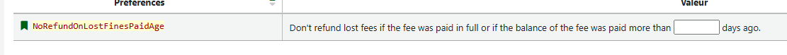 - Une nouvelle préférence système « NoRefundOnLostFinesPaidAge » permet de contrôler combien de temps après le paiement des frais perdus un remboursement sera émis si l'article est retrouvé et retourné.https://bugs.koha-community.org/bugzilla3/show_bug.cgi?id=28575