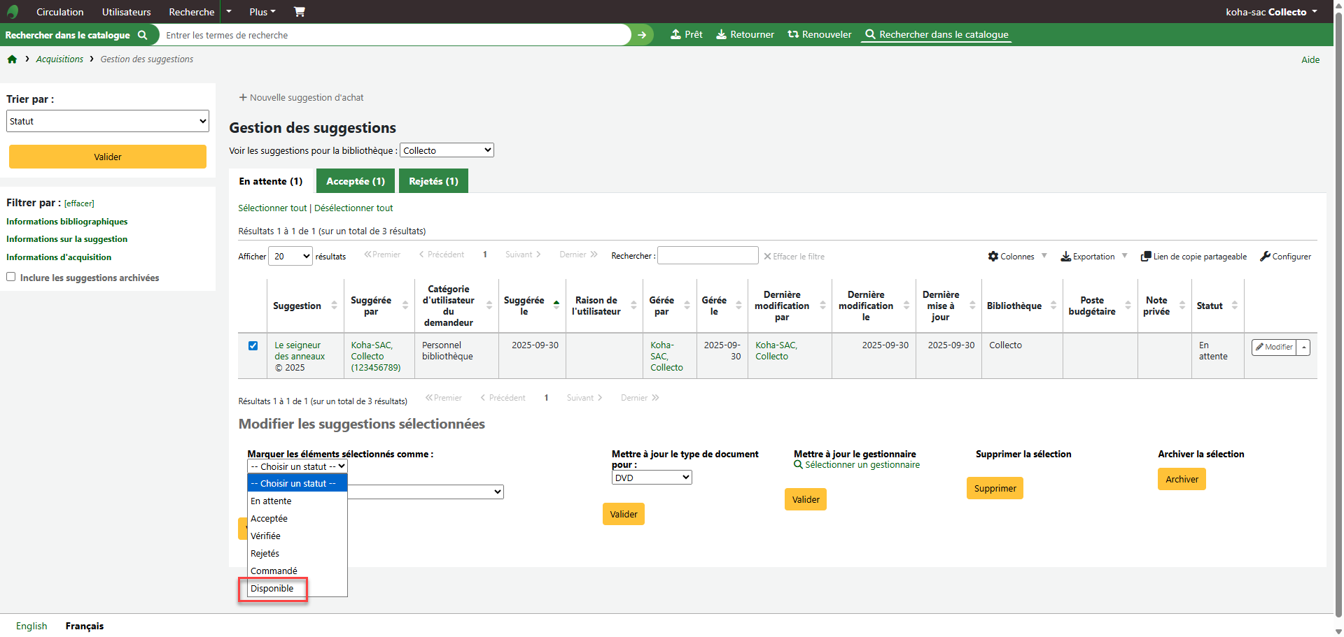- Cette amélioration permet de marquer une suggestion comme disponible même si elle n'est pas liée à une commande. La notification « AVAILABLE» est alors envoyée à l'usager. https://bugs.koha-community.org/bugzilla3/show_bug.cgi?id=37588