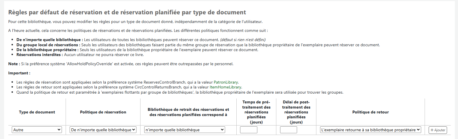 - Amélioration de la fonctionnalité de réservation récemment ajoutée permet aux bibliothèques de définir une période d'entrée et de sortie à ajouter au début et à la fin des réservations. Il est possible d'ajouter plusieurs règles. https://bugs.koha-community.org/bugzilla3/show_bug.cgi?id=34440