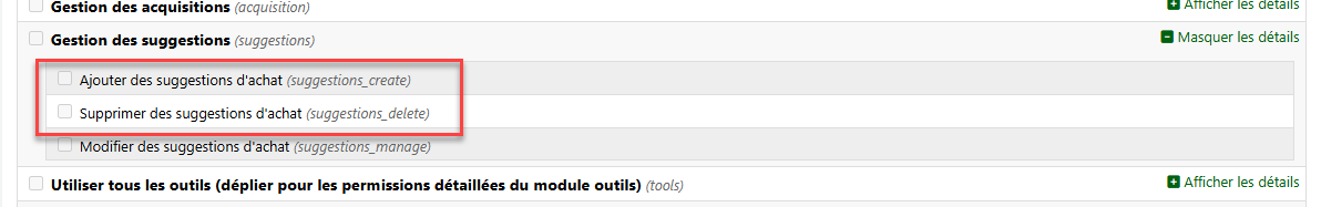 Nouvelle permission pour la gestion des suggestions. Ces nouvelles permissions permettent la gestion des ajouts et suppressions des suggestions.