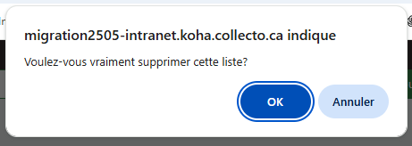 - Cette amélioration ajoute une étape de confirmation lors de la suppression d'une liste depuis les onglets « Vos listes » et « Listes publiques » de l'interface du personnel. Auparavant, il n'était pas demandé de confirmer la suppression. Cette opération est désormais cohérente avec la suppression d'une liste depuis sa page de contenu, où il vous est demandé de confirmer la suppression. https://bugs.koha-community.org/bugzilla3/show_bug.cgi?id=38302
