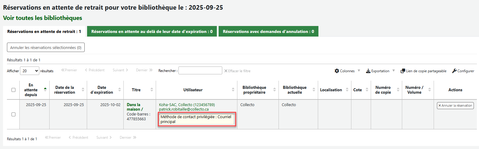 - Les réservations en attente de retrait inclus maintenant la méthode de contact principale due l'usager dans le tableau du module circulation. https://bugs.koha-community.org/bugzilla3/show_bug.cgi?id=37860