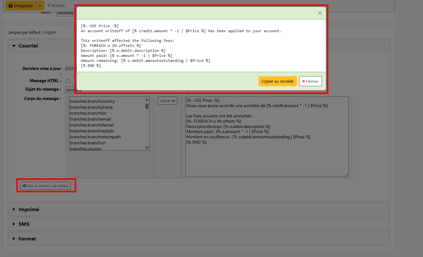 - Ajout de l'option « Voir le contenu par défaut » dans l'éditeur d'une notification. Une fenêtre pop-up va alors montrer la notification originale en anglais avec les balises html. https://bugs.koha-community.org/bugzilla3/show_bug.cgi?id=36815