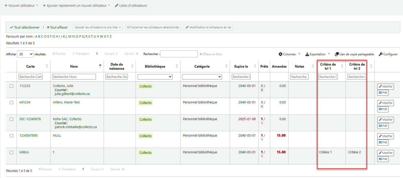 - Cette amélioration permet désormais d'afficher les champs statistiques « sort1 » et « sort2 » des usagers dans les résultats de recherche du module usagers. https://bugs.koha-community.org/bugzilla3/show_bug.cgi?id=34608